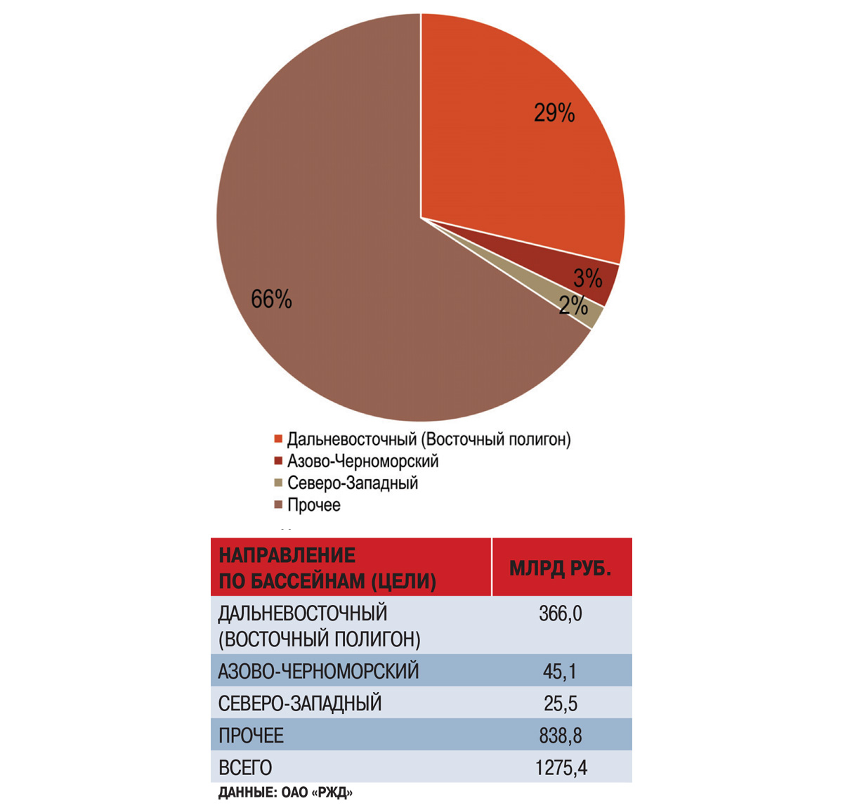 В свою очередь, 67,2 млрд рублей пошло на развитие Центрального транспортного узла и еще 46 млрд рублей – на строительство высокоскоростной магистрали Москва – Санкт-Петербург, чья общая оценочная стоимость – порядка 2,35 трлн рублей. В результате получаем сумму, сопоставимую со всеми предполагаемыми затратами на Восточный полигон и пятикратно превосходящую финансирование ж/д сообщения с портами Азово-Черноморского и Северо-Западного бассейнов вместе взятых.