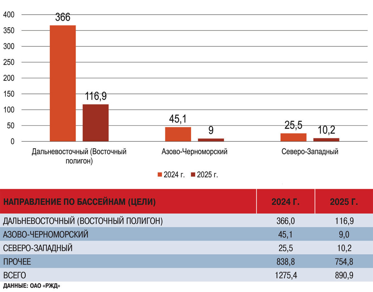 Буквально «под елочку» наступающего 2025-го совет директоров ОАО «РЖД» утвердил новую инвестиционную программу компании на общую сумму всего 890,9 млрд рублей – т.е. более чем на 40% ниже фактического (ок. 1,5 трлн руб.) прошлогоднего показателя. При этом финансирование развития ж/д подъездов к морским портам по сравнению с 2024 годом планировалось урезать в 2,5-5 раз (в частности, для Восточного полигона – более чем в три раза) – рис. 5.