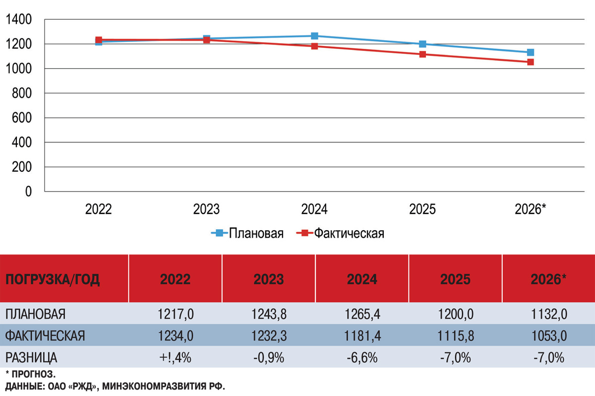 А пока не стоит испытывать никаких иллюзий: согласно предварительным прогнозам ОАО «РЖД», в 2026 году погрузка на сети ожидается в пределах 1132,0 млн тонн – как обычно, «чуть выше» фактически достигнутой в 2025-м, но все же заметно ниже плановой 2024 года (см. рис. 1). Между тем, даже с учетом сохранения существующего «коэффициента недобора», фактические достижения текущего года могут вплотную опуститься к круглой отметке всего в 1 млрд тонн, а на практике рискуют упасть и того ниже.
