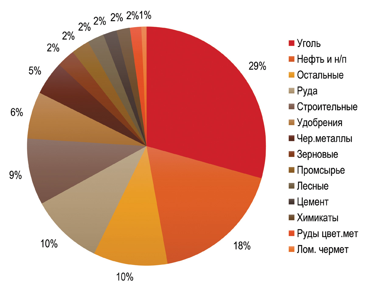 Что касается ассортимента грузов, то по сравнению с 2024 годом доли угля, нефти/нефтепродуктов и железомарганцевых руд выросли в пределах 1% каждая, и по совокупности эта «Большая тройка» составила почти 60% всех объемов отечественных железнодорожных перевозок – рис. 3.