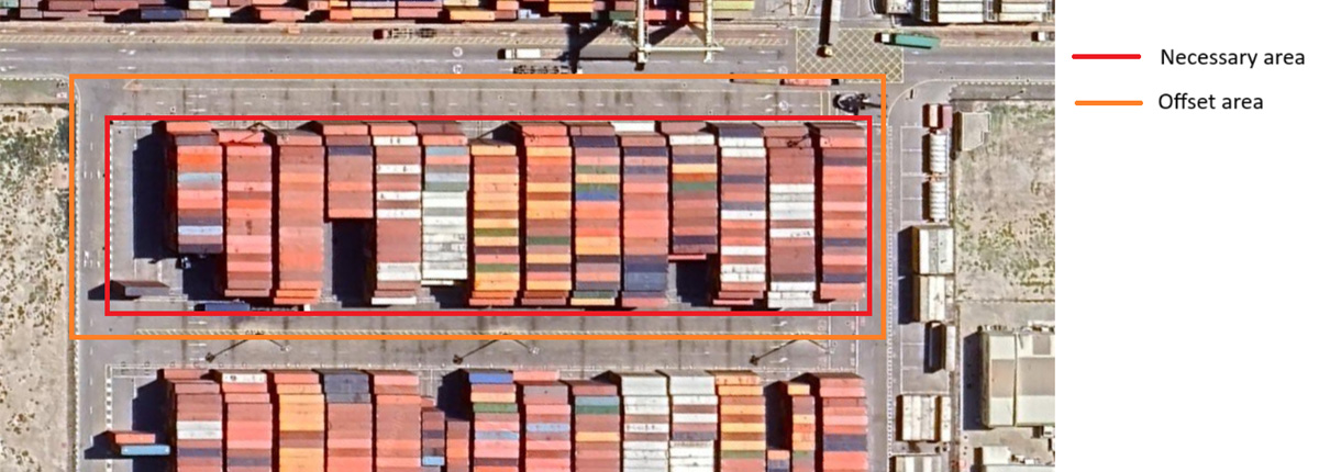 Каждый прямоугольный объект представлен функциональной зоной (например, складской площадкой, причальной зоной) или зданием. При этом каждый прямоугольный объект состоит из площади, необходимой для реализации его основного назначения, и площади, необходимой для перемещения по этой площади, т.е. смещения (рис. 2).