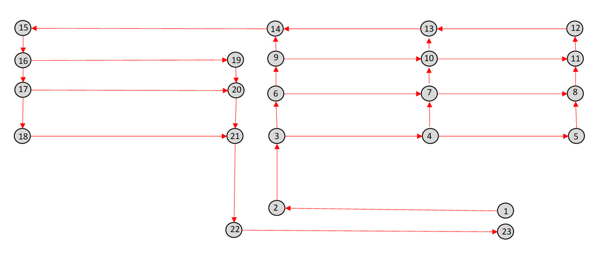 Вершины на этой диаграмме – это пункты назначения и перекрестки, а ребра – сами дороги. Этот график используется для описания движения транспортного средства при выполнении определенной операции. Таким образом, операция определяется как набор пунктов назначения, например «1-2-3-4-13-14-15-18-21-22-23».