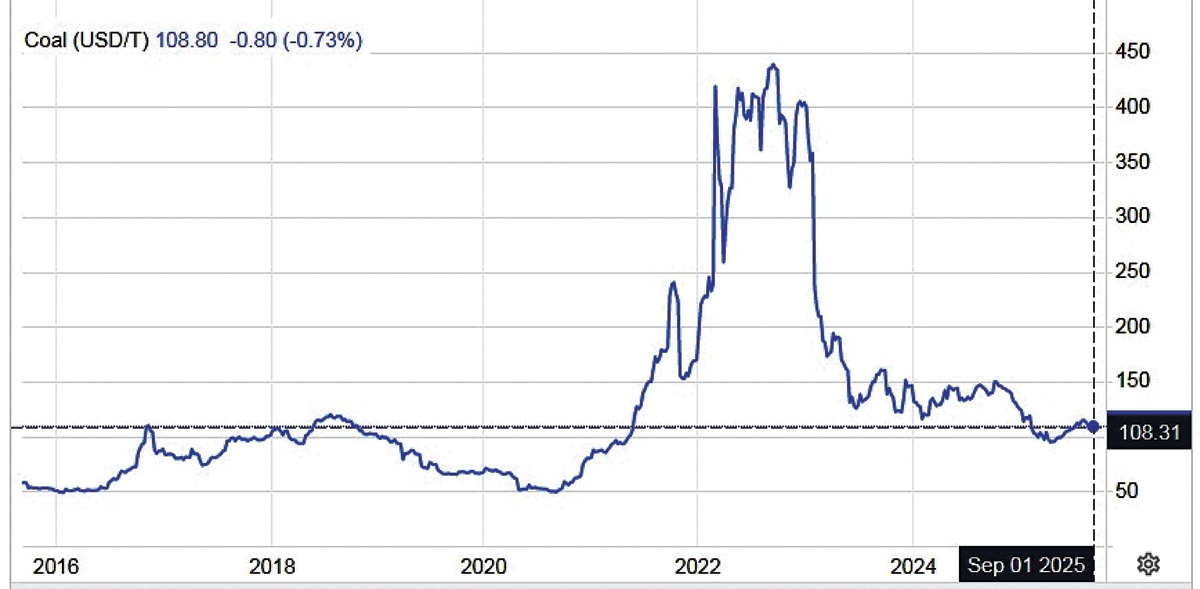 К 1 сентября текущего года средние биржевые цены на каменный уголь составили едва $108 за тонну, т.е. фактически просели до 10-летнего с ноября 2016 года минимума и оказались в четыре раза ниже своего потолка в сентябре 2022 года – порядка $440 за тонну (рис. 1).