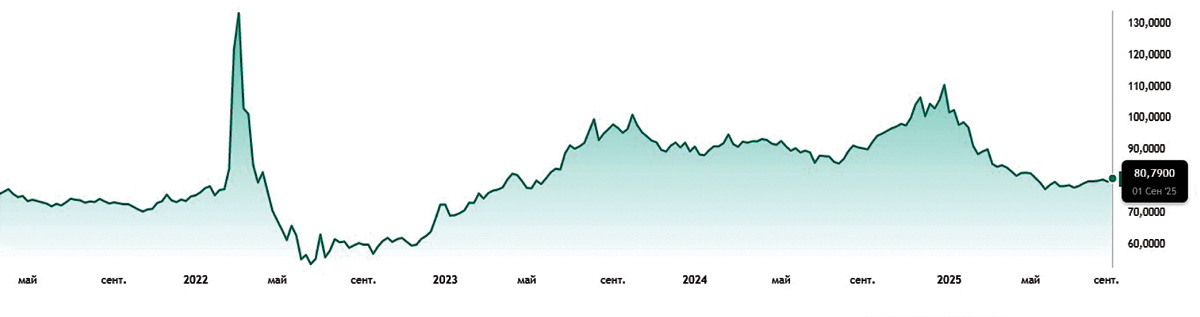 Следует также отметить, что текущий (на 01.09.2025 г.) курс рубля в почти 81/$ заметно (на 15,7 и 12,5% соответственно) выше этих показателей, так что говорить о чрезмерном укреплении российской валюты представляется, мягко говоря, некоторым преувеличением.