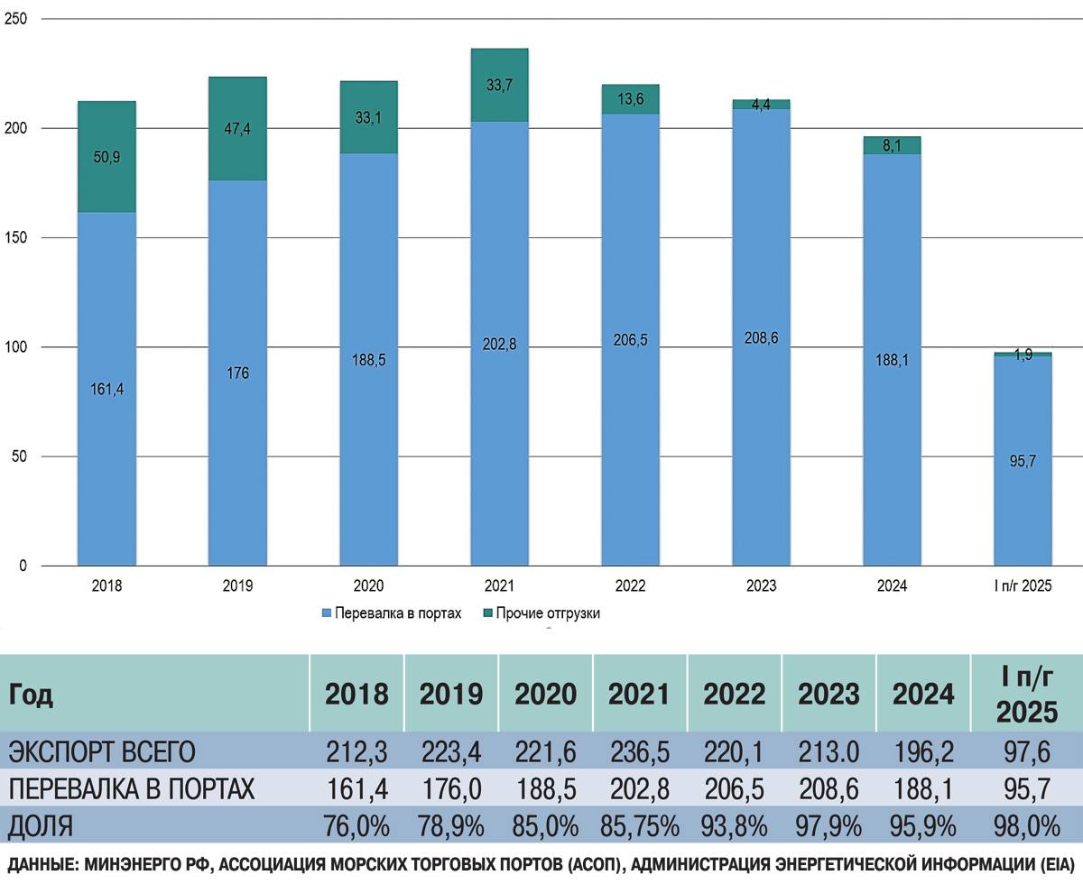 Рис. 2. Экспорт угля из России по годам с учетом доли морских портов, млн т