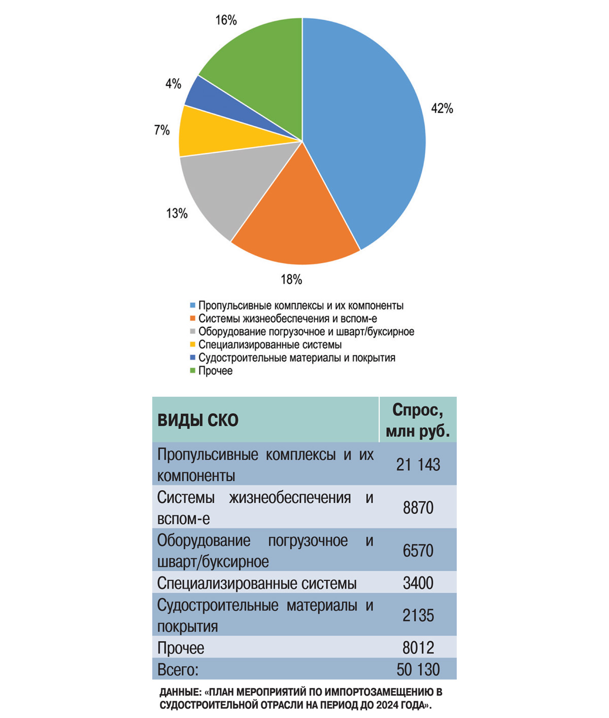 Как видим, дороже всего российским верфям должны были обойтись двигательные системы и их элементы. Что же касается количества (комплектов), то объемы спроса по основным позициям данного сегмента оценивались следующим образом: системы электродвижения – 19, механические винторулевые колонки (ВРК) – 98, главные двигатели – 160, а вспомогательные – 350 комплектов в год! План предусматривал к 2024 году увеличение доли российских аналогов подобной продукции с 5-10 до 15-40% – но даже достижение верхней планки этого показателя означало бы, что свыше 12,5 млрд рублей ежегодно все-таки должны уходить на счета зарубежных поставщиков.