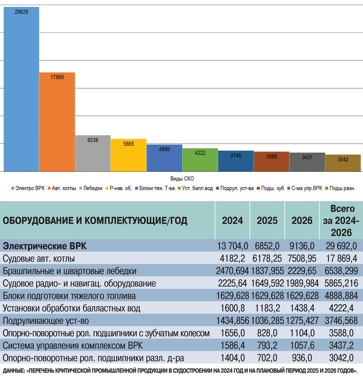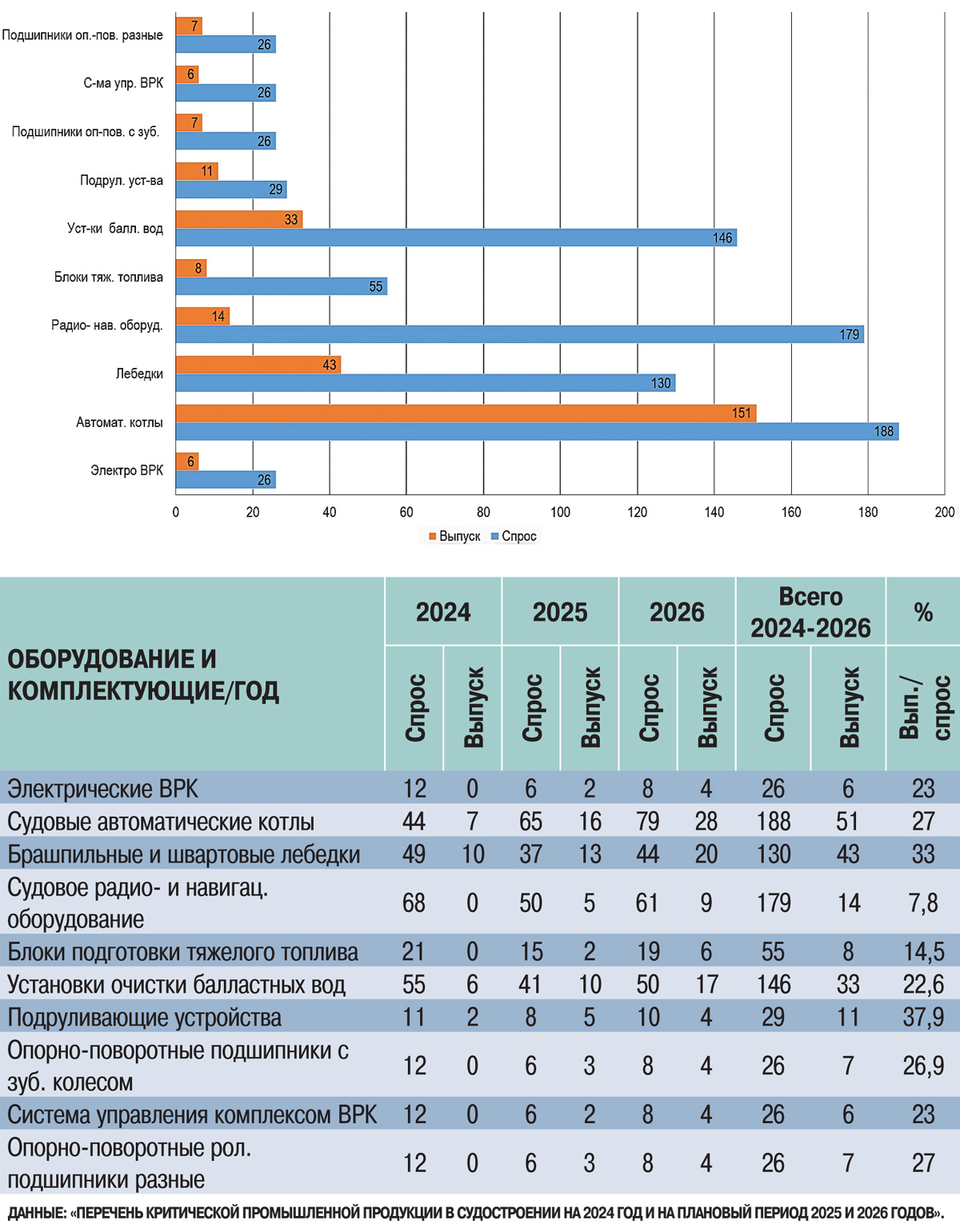 Ожидаемым итогом стало появление уже не официального плана, а всего лишь «Перечня критической промышленной продукции в судостроении на 2024 год и на плановый период 2025 и 2026 годов» (приказ Минпромторга № 1353 от 29.03.24 г.). Тем не менее этот документ содержит весьма интересные данные по уже достигнутым и ожидаемым объемам выпуска ключевых видов СКО в сравнении с развитием спроса на них в ближнесрочной перспективе.