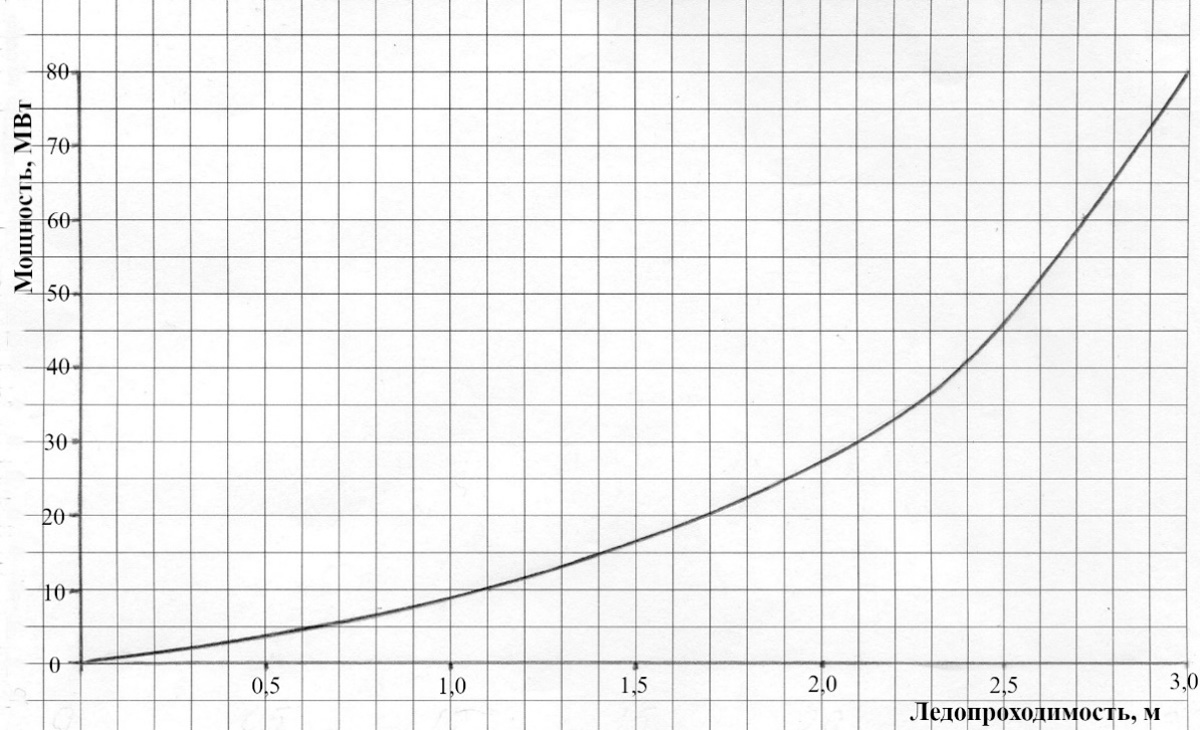 Как можно видеть из графика, уже при ледопроходимости танкера больше 1,9 м он не сможет реализовать полностью свою мощность, следуя в канале за ледоколом, поскольку во льдах толщиной более одного метра скорость прокладки ледоколом канала будет менее скорости, развиваемой танкером в уже заранее проложенном канале, что отмечено штриховкой.