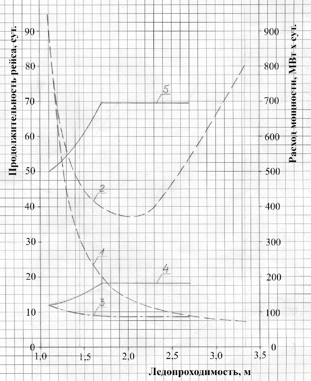 Рис. 3. Зависимость продолжительности транзитного по СМП рейса и затрат мощности танкера дедвейтом 80 тыс. т от его ледопроходимости при самостоятельном плавании (пунктирные кривые) и под проводкой ледокола (сплошные линии): 1 – продолжительность самостоятельного рейса танкера; 2 – затраты мощности танкера при самостоятельном плавании; 3 – продолжительность рейса под проводкой ледокола; 4 – затраты мощности танкера под проводкой ледокола; 5 – суммарные затраты мощности танкера и ледокола