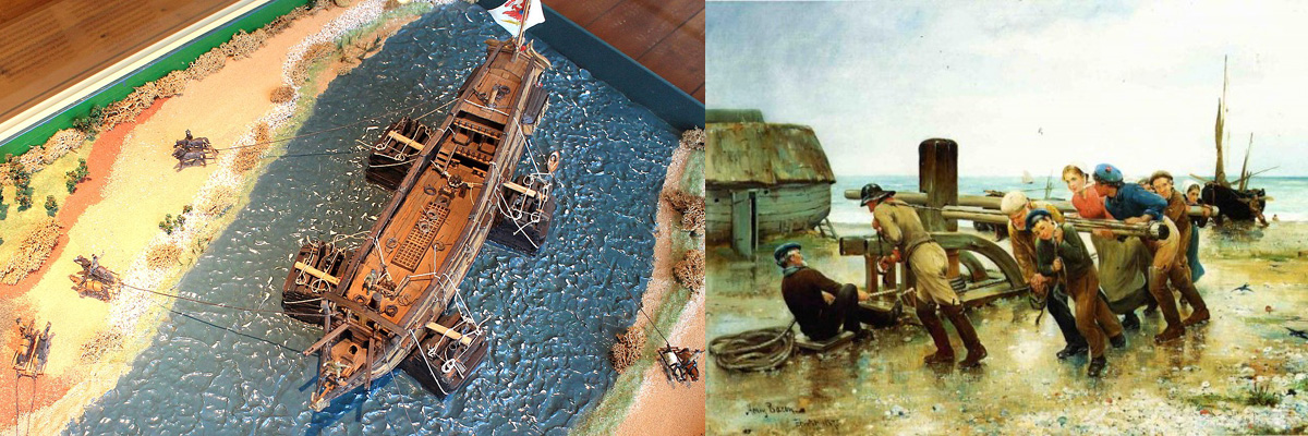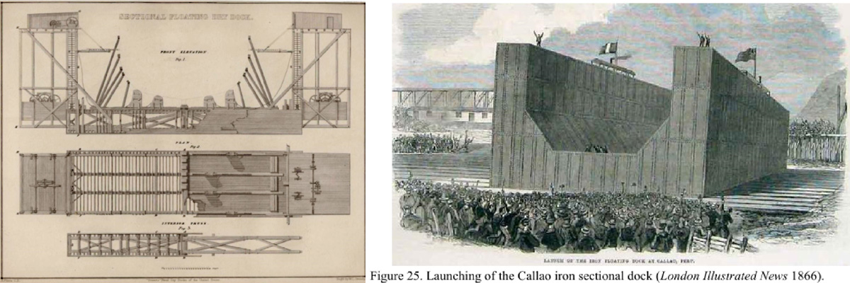Рис. 12. Слева чертеж раннего секционного дока Джона Томаса; справа – спуск железного секционного дока в Кальяо (1866)