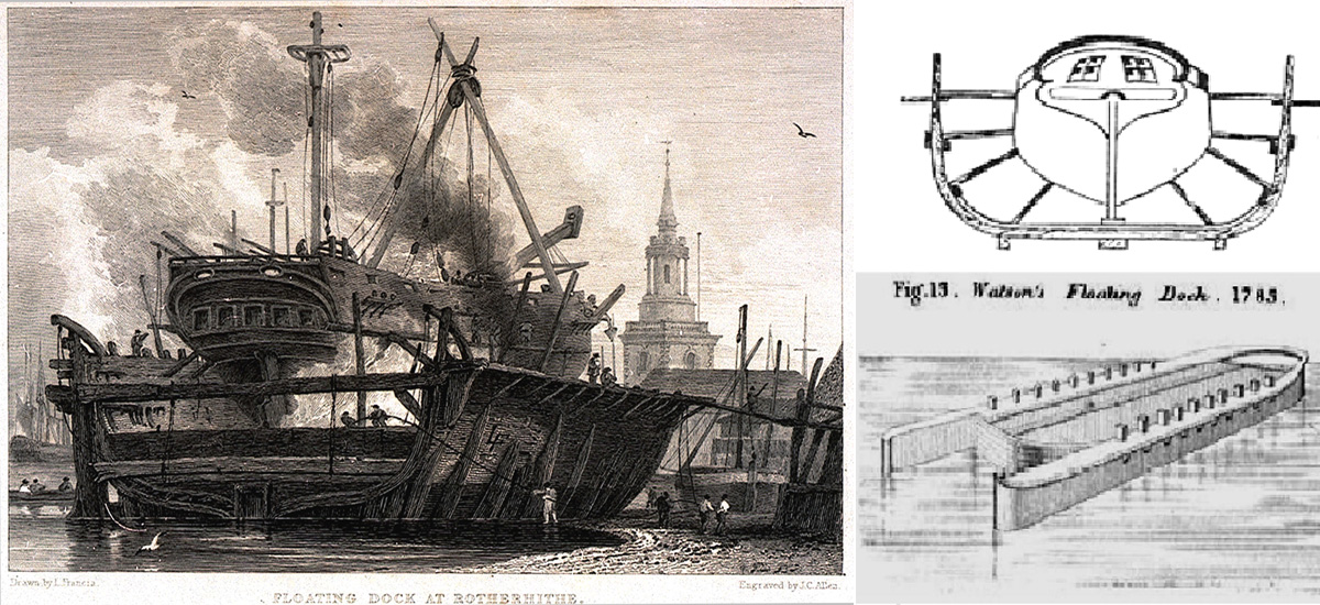 В других портах были построены подобные плавучие доки. Недостатком этих ранних доков была трудность управления и малая остойчивость, для обеспечения которой приходилось использовать параллельные ряды вертикальных свай. Но срок их службы был на удивление долгим. Известно, что док Уотсона активно использовался в течение сорока четырех лет, и, вероятно, его срок службы продолжался еще несколько лет.