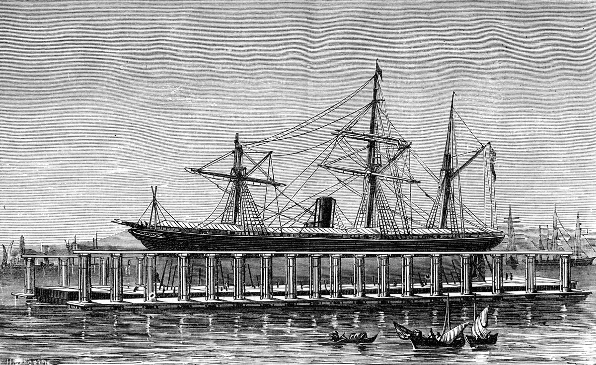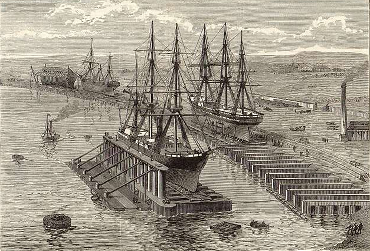 Железо стало широко использоваться только после того, как инженер Эдвин Кларк в начале 1850-х годов спроектировал гидравлический подъемный док, в котором прямоугольные железные понтоны поднимались не насосами, а рядом гидравлических поршней, встроенных в мощные фундаменты на дне гавани.
