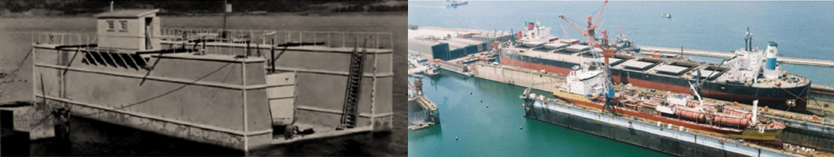 Рис. 11. Слева первый в мире железобетонный док (Норвегия); справа современный железобетонный плавучий док грузоподъемностью 100000 т в Тузле (Турция)