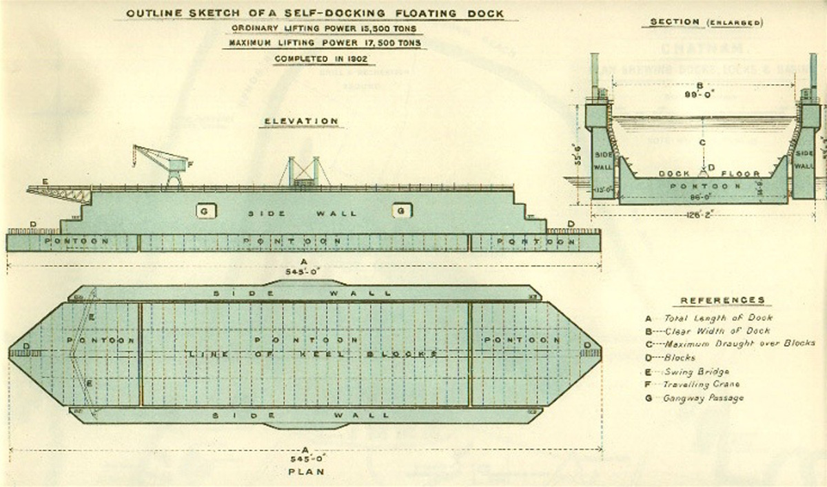 К тому времени плавучие доки приобрели все необходимые компоненты того, что, по сути, представляет собой современный плавучий док – две башни с каждой стороны дока и возвышающиеся над основным понтоном, в которых размещалось насосное отделение, котлы и паровые машины. Основной понтон делился на водонепроницаемые отсеки, позволявшие регулировать крен и дифферент. В этот переломный период инженеры больше не стремились изобретать новые методы докования судов; скорее, они посвятили свою энергию максимальному усовершенствованию существующих технологий с использованием улучшенных судостроительных материалов.