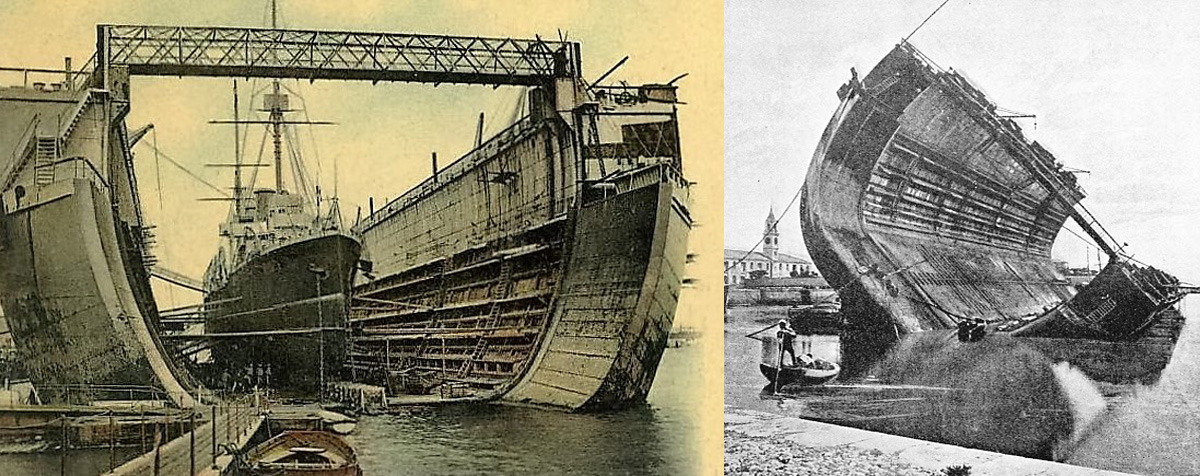 Рис. 27. Вспомогательный крейсер HMS «Psyche» в доке на Бермудах, 1900 г., справа – док накренен для очистки
