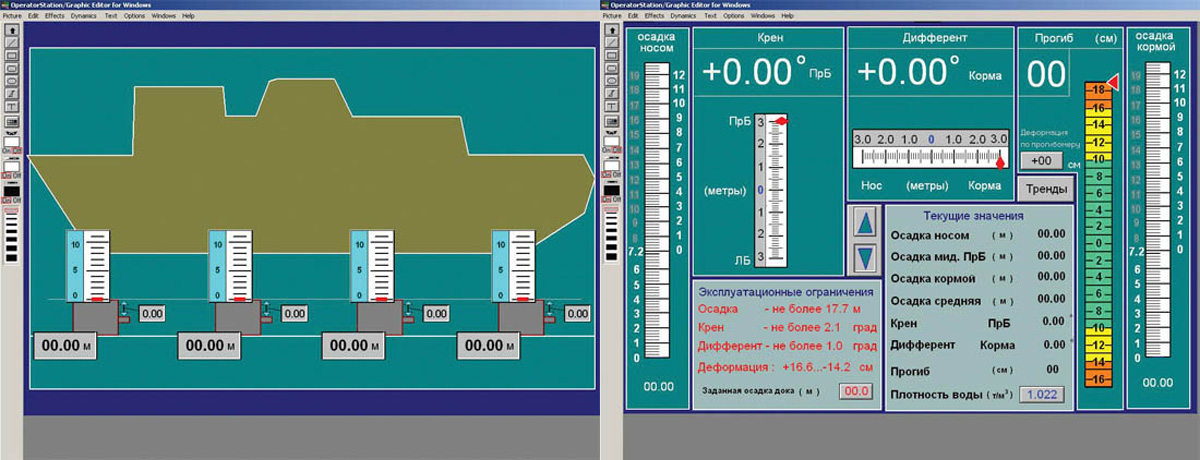 Рис. 38. Информация на экране операторской станции: посадка дока и деформации корпуса (справа) и контроль положения судна в доке (слева)