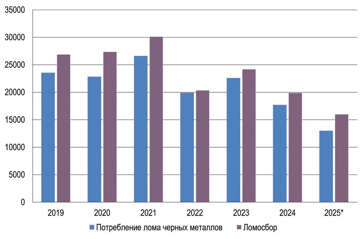 Рис. 1. Динамика ломосбора и потребления лома черных металлов в России, 2019-2025 гг. (тыс. тонн)