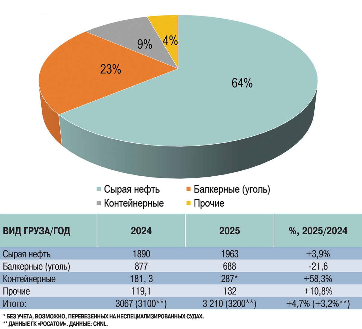 По сравнению с 2024 годом заметно (+2%) увеличилась доля перевозок по Севморпути сырой нефти, в части контейнерных грузов их доля возросла в 2,5 раза, а «прочих» – осталась практически неизменной. При этом ниша сухих грузов сократилась в пределах 5%. Таким образом, экспертные оценки CHNL в целом соответствуют отчетным цифрам официальных отечественных источников. Однако есть и любопытный нюанс, непосредственно касающийся именно контейнерных перевозок, на ускоренном развитии которых в 2025 году руководство ГК «Росатом» как раз и делает особый акцент.